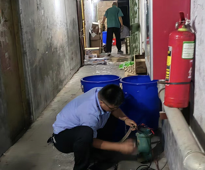 暴雨期間,安保部加強防汛檢查,發(fā)現(xiàn)積水后,及時攜帶抽水設(shè)備協(xié)助保潔員迅速清理,排除安全隱患。