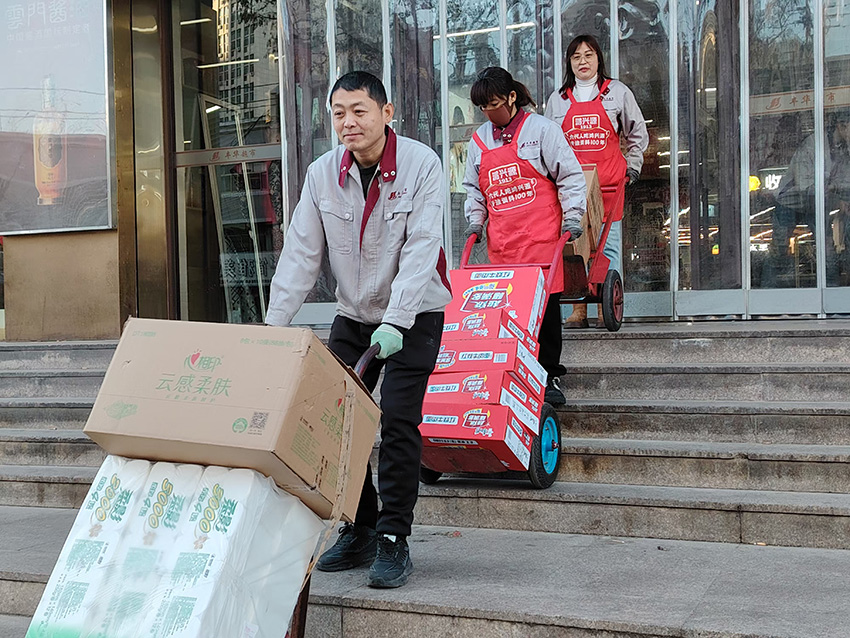 12月31日,民生店同事們齊心協(xié)力,利用開店前時間,裝配團購商品,確保團購業(yè)務及時配送。