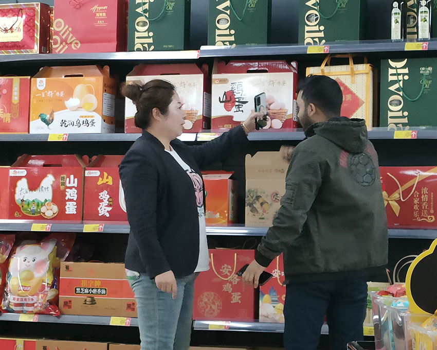 事情是這樣的,有一次,有一個(gè)外國男生站在雞蛋區(qū)那里比劃了半天,張慕華以為是問雞蛋價(jià)格,于是就拿著雞蛋用英語說了價(jià)格。結(jié)果,小男孩著急地捂著肚子,還是不停地在比劃。由于語言不通,比劃了大半天,倆人也沒溝通明白。情急之中,他拿出手機(jī)打下英語,翻譯完后,竟然是問“廁所在哪里?”。看到這句翻譯過來的話,我們都不好意思地笑了。以前,他們雖然也是超市的常客,但基本上不太和我們交流。經(jīng)過這次以后,我們雙方也算是“接上頭”了。我們也學(xué)他通過手機(jī)下載翻譯軟件,把漢語轉(zhuǎn)換成英語,便于溝通,讓他們能有更好的購物體驗(yàn)。后來,經(jīng)過一來二去的溝通交流,我們了解到他們四個(gè)人來自孟加拉國,是來求學(xué)的,住在我們民生店附近,每周三會(huì)定期來采購大米、蔬菜、雞蛋等生活用品。因?yàn)槲疫€算是會(huì)幾句英語,所以只要他們一來,店員們就去叫我,生怕耽誤他們購物。記得還有一次,他們要買橄欖油,我們給他們介紹了好幾種食用的橄欖油都不行,我們也有點(diǎn)不知所措,那個(gè)男生就急得不停地抹臉,看到這個(gè)動(dòng)作我們才恍然大悟,原來是擦臉用的橄欖油啊!
